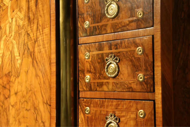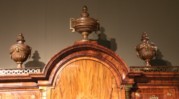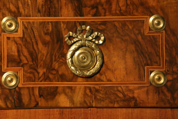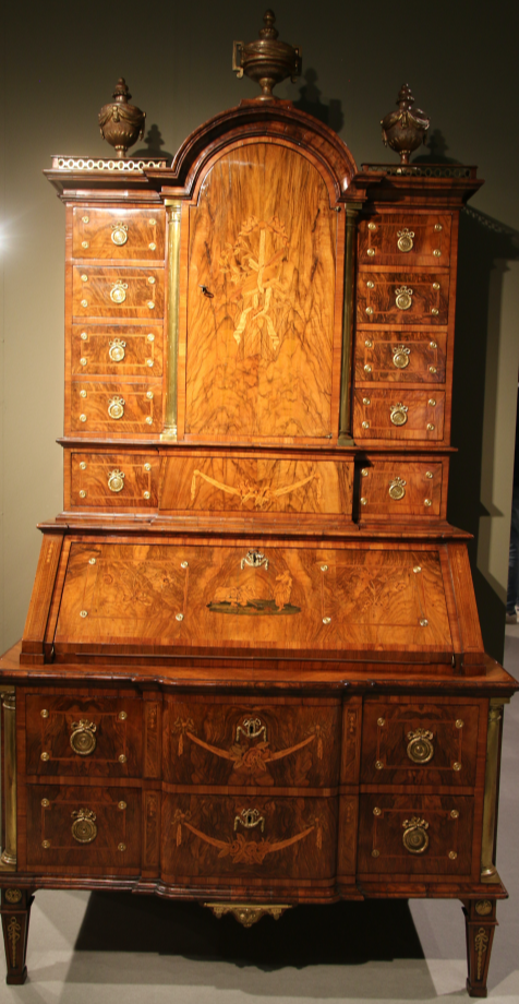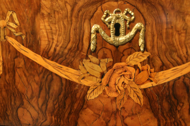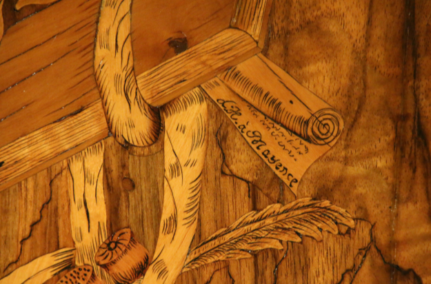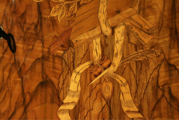 HÖLZER ZUM TEIL BRANDSCHATTIERT, GRAVIERT UND GEFÄRBT, MARKETERIEN MIT FESTONS, BLUMEN, BÜCHER MIT SCHLEIFEN, PERGAMENTROLLE, LORBEERKRANZ, FEDERKIEL, FIGURALE SCHÄFERSZENE,