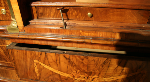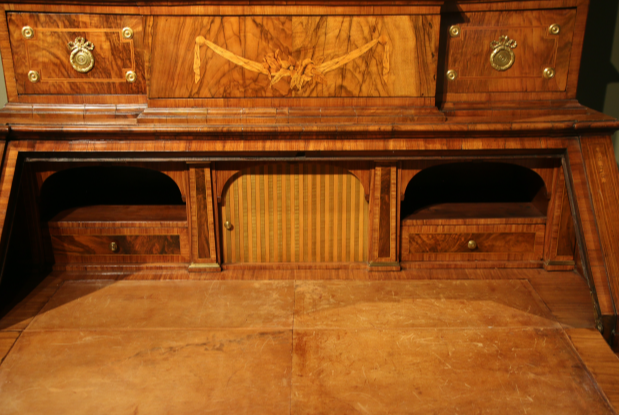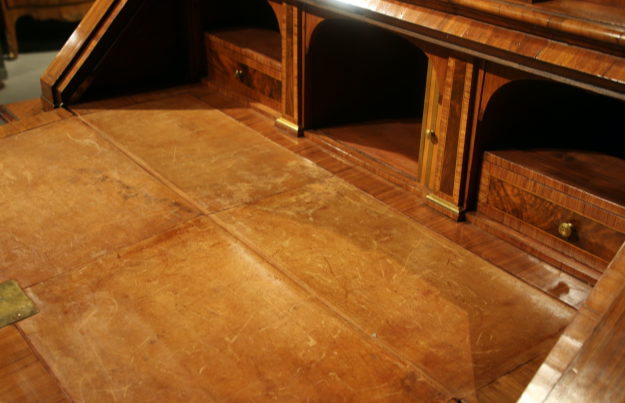 HINTER DER SCHRÄGEN SCHREIBPLATTE IM MITTELTEIL AUFWENDIGES INNENLEBEN